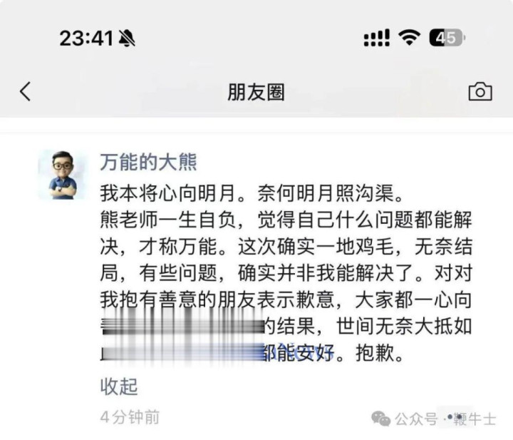 面对此种结局,博主称,“熊老师一生自负,觉得自己什么问题都能解决,才称万能。这次确实一地鸡毛,无奈结局,有些问题,确实并非我能解决了。”
